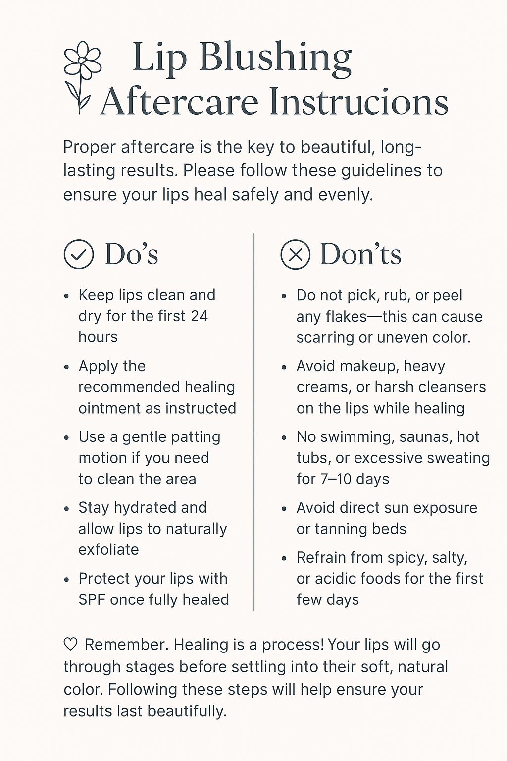 Aftercare & Expectations: Go over healing, aftercare instructions, and what to expect as your lips recover.